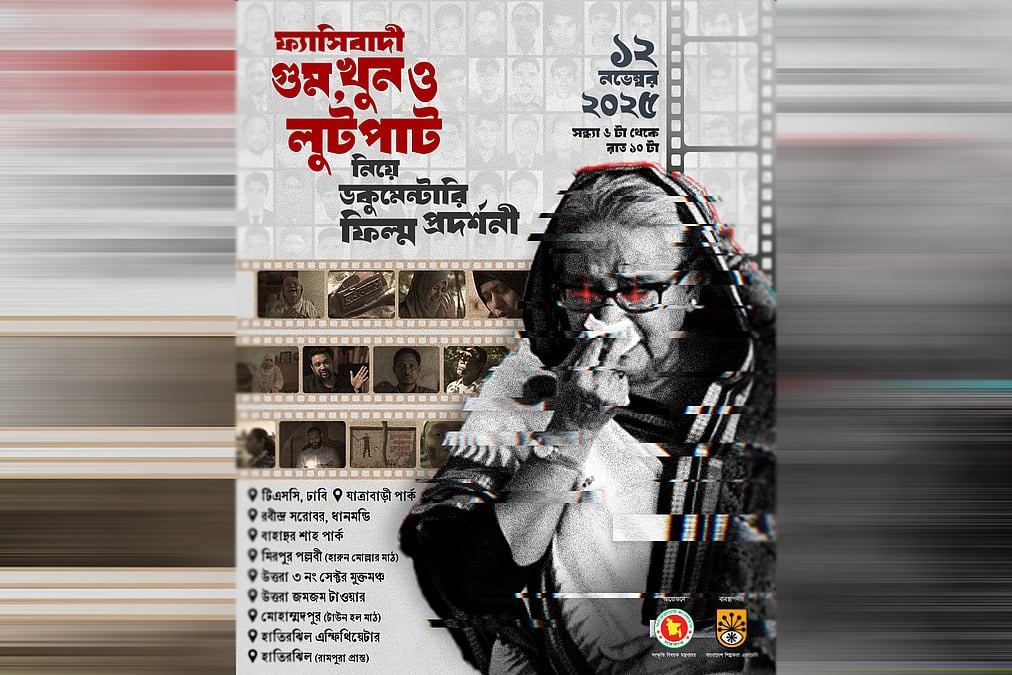 ‘ফ্যাসিবাদী গুম, খুন ও লুটপাট’ নিয়ে আজ ঢাকার দশটি স্থানে প্রামাণ্যচিত্র প্রদর্শনীর করবে সংস্কৃতি বিষয়ক মন্ত্রণালয়। বুধবার (১২ নভেম্বর) সন্ধ্যা
