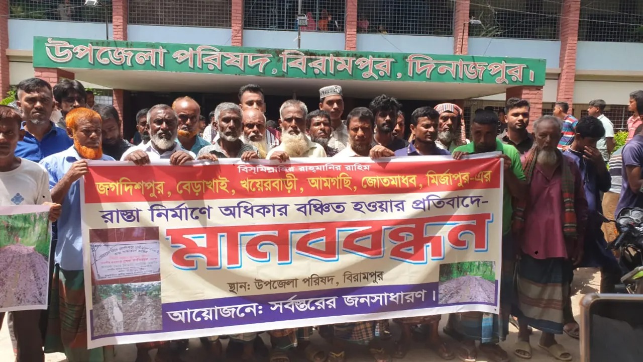 দিনাজপুরের বিরামপুরে চলাচলের অনুপযোগী রাস্তা দ্রুত সংস্কারের দাবিতে মানববন্ধন করেছেন কয়েকটি গ্রামের মানুষ। ‘ত্রাণ চাই না, রাস্তা চাই’, ‘আমরা স্কুলে