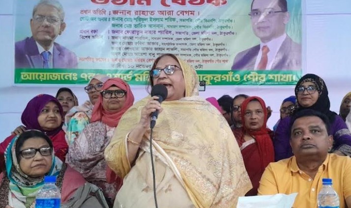 ঠাকুরগাঁও-১ (সদর) আসনে বিএনপি মনোনীত প্রার্থী ও দলটির মহাসচিব মির্জা ফখরুল ইসলাম আলমগীরের সহধর্মিণী রাহাত আরা বেগম এক নারী সমাবেশ