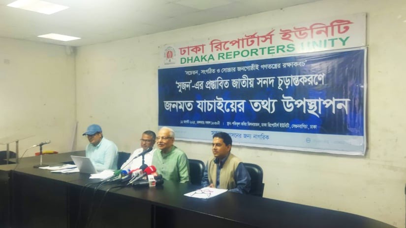 প্রস্তাবিত জাতীয় সনদ চূড়ান্তকরণে জনমত যাচাইয়ের তথ্য উপস্থাপন করেছে নাগরিক সংগঠন ‘সুশাসনের জন্য নাগরিক-সুজন’। মঙ্গলবার সকালে ঢাকা রিপোর্টার্স ইউনিটির (ডিআরইউ)